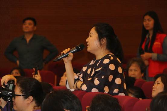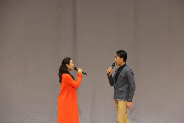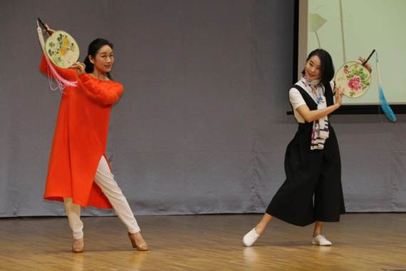图9.曾小敏和朱红星邀请读者上台互动,教授粤剧中的团扇表演