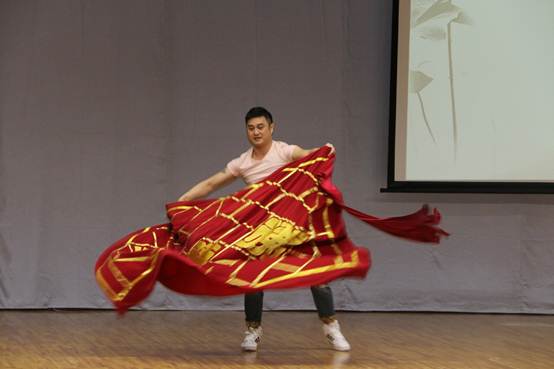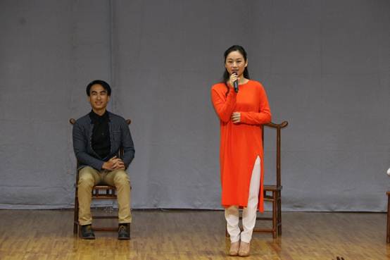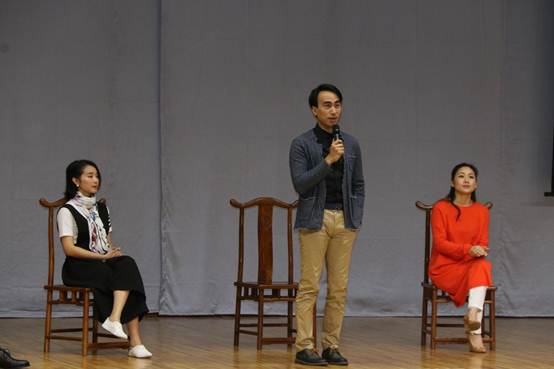 青年演员王燕飞,朱红星分别讲述各自塑造人物的心得。王燕飞即席表演了舞袈裟的精彩技巧。