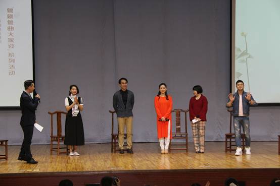 图1.广东粤剧院“大佬倌”们在广州图书馆与读者见面。左起:彭庆华(主持人)、朱红星、文汝青、曾小敏、莫非、王燕飞