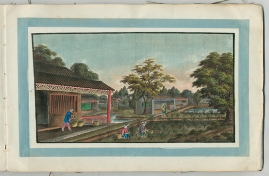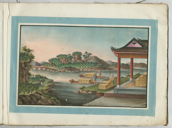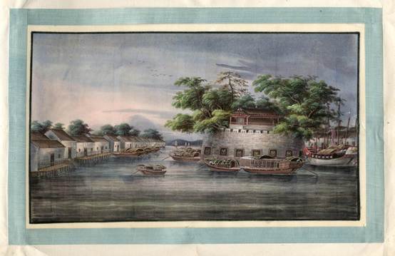 乾隆二十二年(1757年),清政府为维护自给自足的封建自然经济和清朝的封建专制统治,特许“十三行”垄断了中国与外商的经济往来,并规定广州是允许外商来华贸易的唯一口岸,但在广州也只有少数地方(郊区、黄埔古港、珠江沿海一带)被允许成为彼此间的经商区域。程存洁老师指出正是这个原因,通草画所反映的题材几乎是港口风景、虎门大桥、黄埔古港、广州赛龙舟等广州特色景物。通草画的选材十分真实的反映了当时社会的市井风情,从图中我们如临其境的感受到当时社会的文化、风俗、生活习惯等。