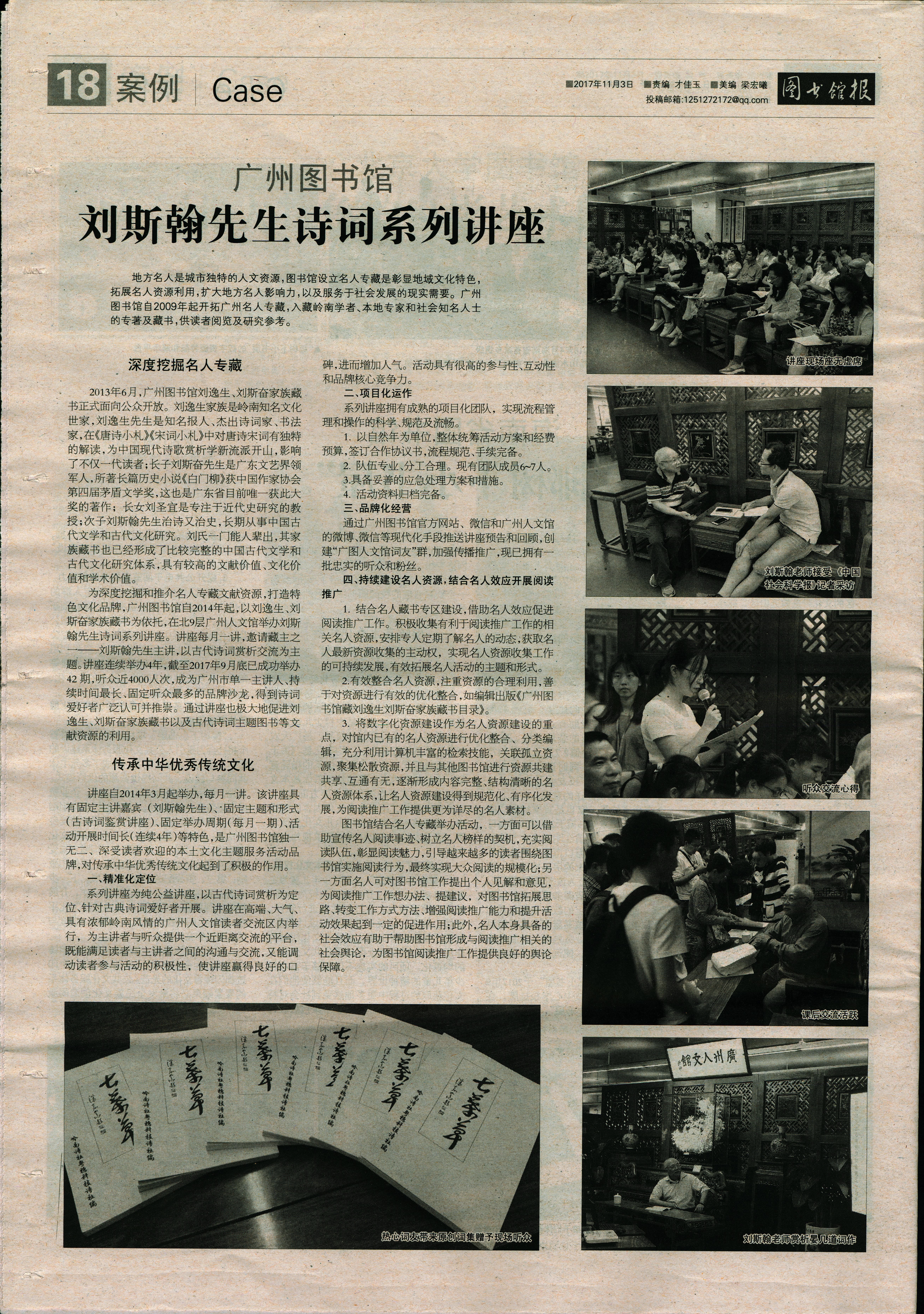 中国图书馆学会社区与乡村阅读推广委员会主任徐益波高度肯定了我馆的“刘斯翰先生诗词系列讲座”,他认为“刘斯翰先生诗词系列讲座”充分整合了广州图书馆馆藏特有的本土名人资源,不仅通过活动的开展有效开发利用馆藏,推送精品,而且案例主题贴合中华传统文化主题,有利于弘扬国学,同时“刘斯翰先生诗词系列讲座”以沙龙活动的方式长期举办,坚持4年,十分有助于形成固定听众。