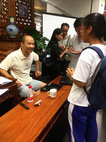 图4.讲座结束后,石牛老师耐心地为一位学生读者解答诗词赏析书籍的挑选问题
