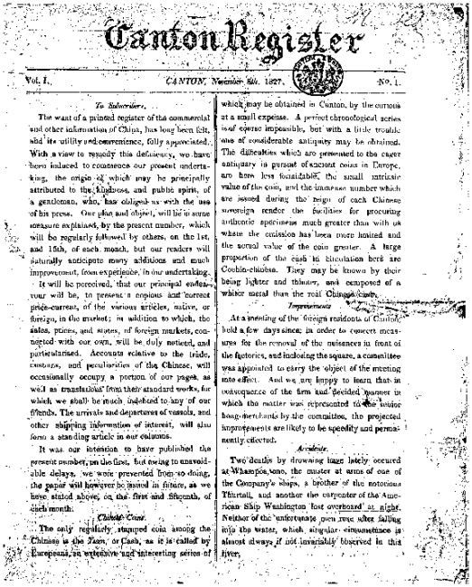公共传播媒介,如报纸、期刊、电视、互联网等,是现代社会最重要的表达工具和信息传播渠道,与国家及社会的发展、民众生活的关系十分密切。中国最早的公共传播媒介也是在广州诞生的。1830年前后,来华西人在广州创办、发行了一批最早的中、外文报刊,例如《广州纪事报》《广州周报》《东西洋考每月统记传》《中国信使报》等,这批中外文报刊是中西文化深入交流的标志和体现,在文化史、学术史、中西关系史上均有深刻影响。