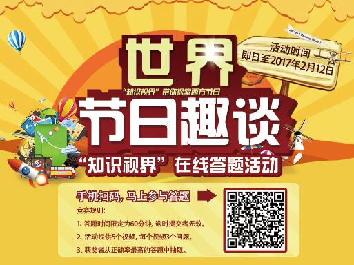 祭祖、拜年、贴春联,春节已经有了4000多年的历史,它是中华民族最隆重的传统佳节。可是国外是如何庆祝新年的?他们还会纪念哪些盛大的节日?这些节日又有什么独特的历史和有趣的习俗?2017年1月1日至2月12日,我们与“知识视界”合作,精选五段科普小视频,让读者可以在线边看视频边答题,完成对世界几大特别节日的探索。为方便移动端读者的参与,活动还特别制作了微信页面,用手机扫一扫二维码,即可轻松参与答题活动。活动吸引了1903人点击关注。