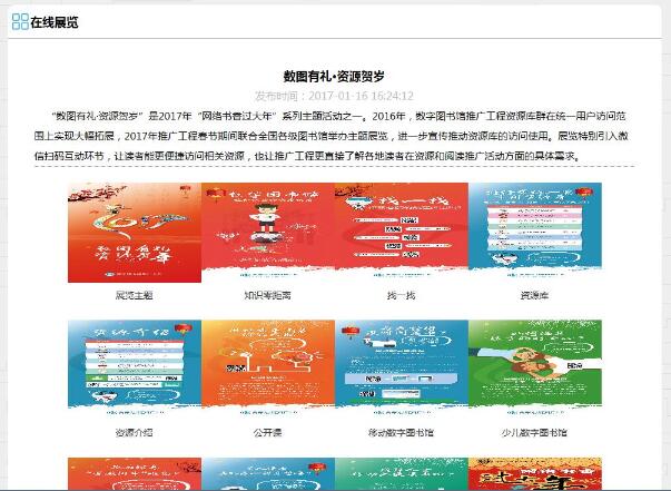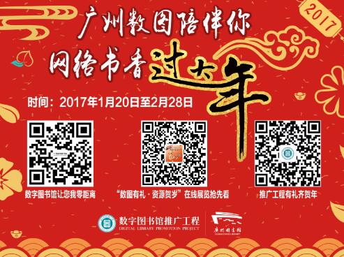 2017年1月20日至2月28日,我们推出了“广州数图你,网络书香过大年”新春线上活动,活动推出三周就吸引了近两千人关注。广州数字图书馆除了在线办证、图书推荐、海量资源免费用等各种零距离个性服务,还特别准备了“数图有礼•资源贺岁”在线展览,向读者展示数字图书馆可看、可学、可娱乐、可互动等意想不到的精彩内容及丰富面貌。