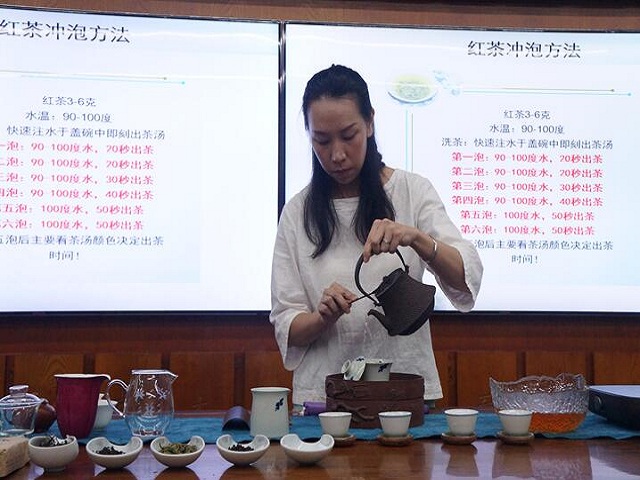 曹阳老师说,要泡出好喝的茶,好茶、好水、好茶具都是必不可少的。完整的一套茶具包括:盖碗(或茶壶)一个、茶荷一个、茶挖一个、公道壶一个、品茗杯若干、茶巾一块、壶承一个、水盂一个、煮水器一个。此外,泡茶的技巧也很关键,如泡红茶,一壶红茶以3-6克为宜,水温90-100度。第一泡茶90-100度水,20秒出茶;第二泡茶90-100度水,20秒出茶;第三泡茶90-100度水,30秒出茶;第四泡茶90-100度水,40秒出茶;第五泡茶100度水,50秒出茶;第六泡茶100度水,50秒出茶。五泡后主要看茶汤颜色决定出茶时间。