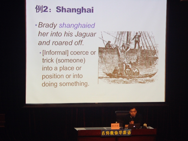 赖老师以”shanghai”一词举例。我们理解中的”Shanghai”是名词“上海”的意思,但是当“S”写作小写的时候,”shanghai”即变成了动词,为“绑架、以欺骗手段从事某事”之意。这是怎么回事呢?赖老师介绍道: 19世纪以前,中国输出到美国旧金山的劳工多从上海港口出发。大批劳工被虚假宣传所骗,登上了生死未卜的“卖猪仔”之旅;上海作为当时运送被拐骗的船员的主要地点,因此衍生出了“绑架”与“以欺骗手段从事某事”等意思。了解了这段历史,我们使用英语的时候,就能避免因为望词生意而造成的理解不当。