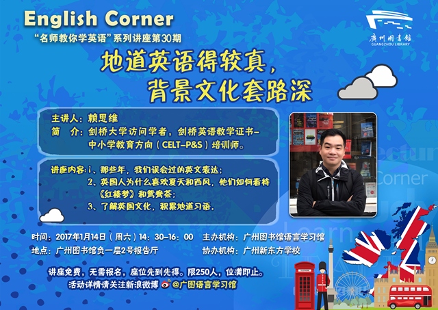 1月14日(周六)下午,“名师教你学英语”系列讲座特邀剑桥大学访问学者赖思维,与读者一起领略语言文化与传承,开讲《地道英语得较真,背景文化套路深》。
