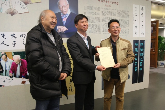 图2:广州图书馆馆长方家忠向广东省文联专职副主席洪楚平先生颁发赠书感谢状。