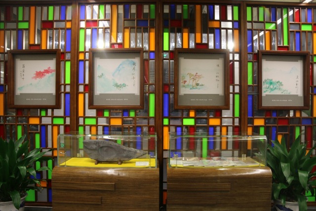 图6:国画•饶宗颐绘《羊城八景》之二,展柜左为饶宗颐铭刻鱼砚。