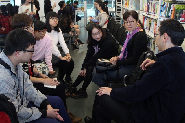 分享会伊始,主讲人刘晨做了自我介绍并向观众引入破冰环节,其他主讲人与观众坐在一起,以小组形式将大家组织起来介绍自己,引导他们开口说英语。在大家相互认识,对彼此有了大致了解之后,话题正式开始。