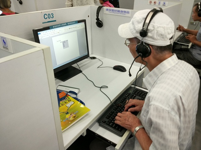 随着课程的推进,老师开始讲词组输入与文章输入。老人们心知重头戏来了,纷纷如临大敌,推起老花镜,翻开笔记本聚精会神地记笔记。讲完了理论,他们开始了人生中第一次中文打字练习,虽有前面简单字符输入练习的铺垫,可有些老人还是颇为紧张,一紧张,敲键盘的力度就大了,“砰”“砰”的声音一响起,总被周围人打趣,为了舒缓老人的紧张情绪,助教及工作人员也会趁着气氛开几句玩笑,培训区中笑声连连。几番大笑下来,老人们放松不少,不再紧绷绷地盯着键盘和屏幕,彼此交流起心得体会,键盘敲击声轻巧了,屏幕上的字也越来越多了。
