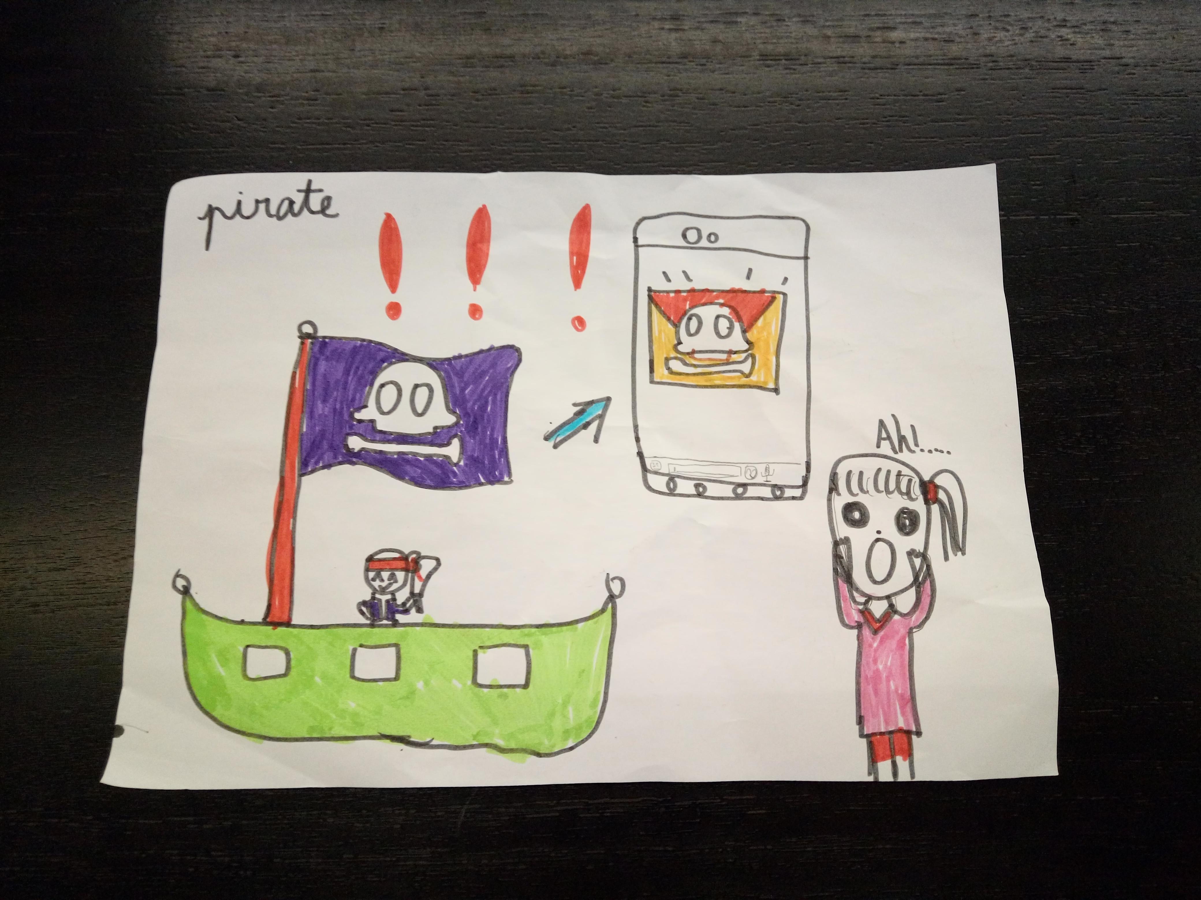 “因为Pirate这个词的意思是海盗、黑客,所以我画了一个海盗的手机被黑客攻击了。