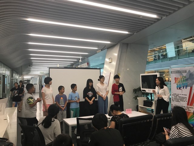 在基本讲解之后,志愿者老师进行现场配音演示。她先向读者们展示了一段已经配好音的视频,呈现的短视频是《神偷奶爸》中的片段,大部分读者都表示之前有看过这部动画,觉得很有趣。接着,志愿者老师与王嘉宁进行分角色配音,按照视频的难易程度,分别选取了《疯狂原始人》和《粉丝猪小妹》片段,使读者们进一步熟悉了软件的操作。此外,还加入了互动环节,志愿者老师邀请了几位小读者参与配音,有一些小读者一开始还害羞不敢上台,不过在家长和老师的鼓励下,小读者们都鼓足勇气,变得积极踊跃起来。其中一位小男孩为动漫中蓝色小熊配音,情感丰富,模仿到位,富有节奏感,得到了一致的好评。虽然在这个过程中有些小读者遇到了一些小难题,比如:英语单词较复杂、句子长、语速快等,但在志愿者老师的耐心帮助下,他们都能逐渐放松心态,操作也越发熟练,最终顺利地完成每一个配音作品。