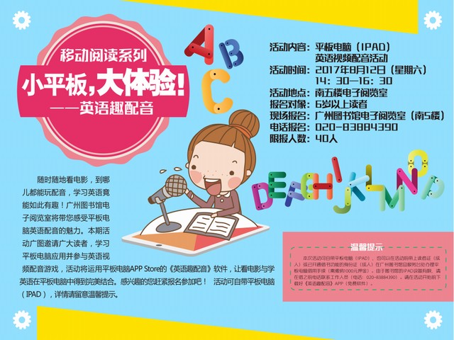 8月12日,“小平板、大体验”移动阅读系列活动在广州图书馆南五楼电子阅览室顺利举行。此次活动将平板电脑与“英语趣配音”APP相结合,向读者展现了全新的英语学习方式,活动题材新颖、有趣,共吸引了30位读者参与。