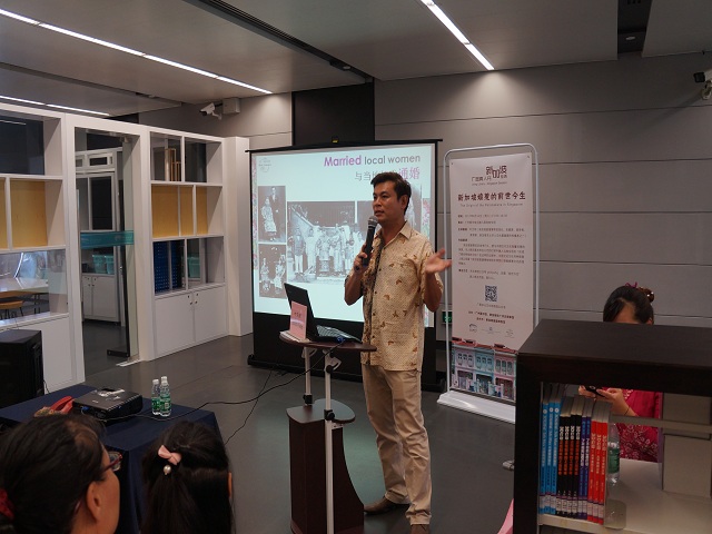 8月12日下午,【广图真人书】新加坡专场活动在北楼八层多元文化馆举行。本期活动的“真人书”嘉宾是新加坡盈壇博物馆馆长叶艾明,他以“娘惹后代”的身份为现场读者讲述新加坡娘惹的“前世今生”,主要介绍了新加坡娘惹的历史、民俗、盈壇博物馆创立的初衷及各类珍贵馆藏。透过他的讲述,现场读者得以窥见一个“比华人还华人”的娘惹世界。