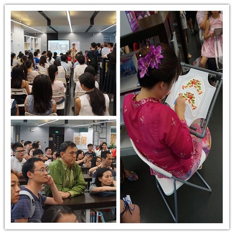 新加坡娘惹至今仍保留了很多传统的生活习惯和民间工艺,比如娘惹手工珠绣工艺。讲座中,叶艾明馆长特意请出了妹妹郭雪为大家讲解娘惹绣珠鞋的制作过程。娘惹绣珠鞋中的绣珠非常小,普通人每天最多绣上四十五分钟,就要停下来,否则会伤眼。一双普通的绣珠鞋,至少需要大半年才能手工制作完毕。