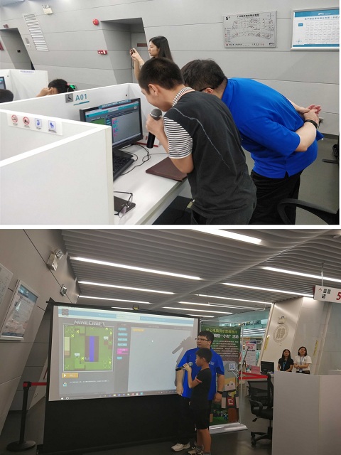 接着,为了更好地让读者在游戏中体会编程的乐趣,培养他们对编程的兴趣,卢老师便利用微软“我的世界”营造了游戏的编程环境,将时间交给读者自行操作,并在志愿者的协助下进行现场指导及疑问解答。在简单的沙盘模式下,运用这个开放的平台,读者们可以自由地选定角色、设置任务,并通过拖动程序模块来完成程序的编写,还能够以通关的形式,使得游戏中的人物执行一系列的指令。