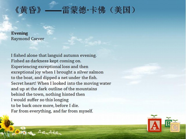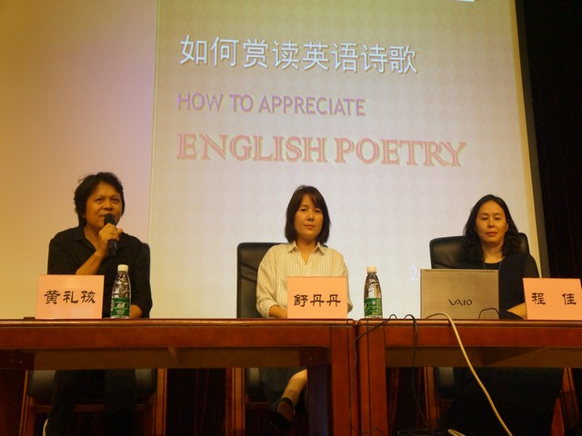 程佳老师既是一位翻译家,又是一位诗人。她认为,赏读英文诗歌,需要关注几大要素:音(Sound)、形(Form)、意(Sense)、象(Imagery)。“音”即诗歌的节奏和韵律。诗歌的最大特征是韵律。要欣赏英文诗歌,首先要把英文诗歌的韵律搞清楚。韵律也是构成英文诗歌节奏的基础。“形”即诗歌的文体形式。英文诗歌按照不同的标准划分,类型有所不同。按照表现形式来划分,有格律诗、自由诗、散文诗等;按照艺术表现手法来划分,有朦胧诗、朗诵诗等;按照内容来划分,有叙事诗、抒情诗等。“意”即诗歌所表现的主题。如爱情、生命、离别、自然、战争等等主题。“象”即诗歌蕴含的意象。诗歌的艺术表现力和感染力,就在于诗歌意象、意境的独特、瑰丽,韵律、节奏的和谐、优美,以及思想感情的真实、动人。因此,欣赏诗歌可以怡情怡性。
