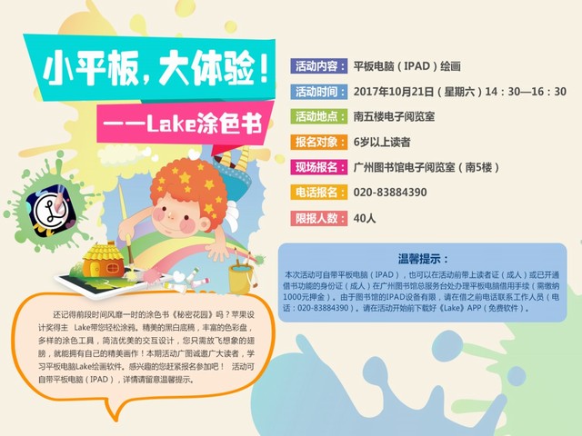 10月21日,“小平板、大体验”移动阅读系列活动在广州图书馆南五楼电子阅览室顺利举行。此次活动我们为大家推介苹果设计奖得主——“LAKE涂色书”涂色设计APP。“LAKE”以精美的黑白底稿、丰富的色彩盘、多样的涂色工具以及简洁优美的交互设计,给读者们一个全新而美丽的创作平台,让人轻而易举地创作出自己喜爱的作品。本次活动共吸引了30位读者参与。
