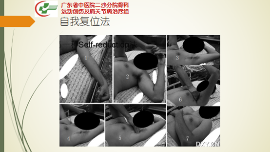 对于习惯性脱位,一般很容易就能够复位,不需要很大的力量。但是第一次脱位有什么方法呢?如果大家去到荒郊野外,万一有这种损伤该怎么办?这时候可以采取一种自救的方法:自我复位法。