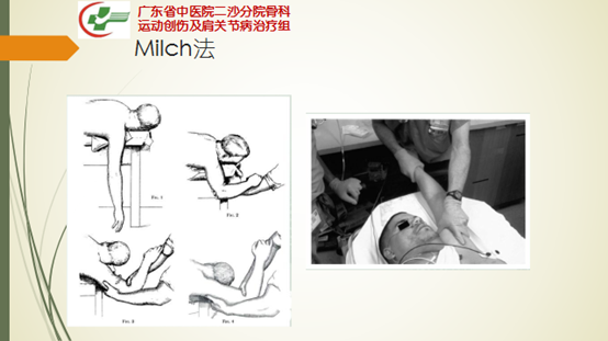 我给大家推荐的是复位手法叫Milch法。这是一个很好的方法,因为肩关节脱位患者,无论严重到什么程度,都是可以趴在床上,不打麻醉药自己完成相关动作的。其实很简单,只需要一点力量,就能很快复位。