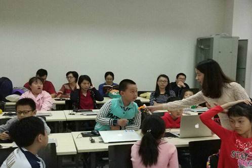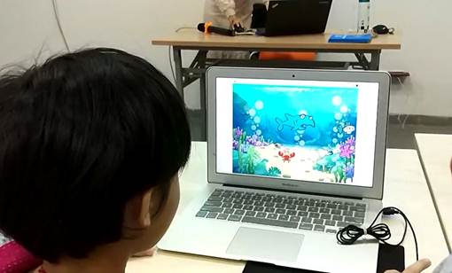 课堂一开始老师就提问:“小朋友们,海底世界是什么样子的呢?”小朋友都纷纷举手回答:“有各种鱼类、有章鱼、水母、海星、海豚,还有可怕的鲨鱼……”老师:“……他们都在海洋的食物链中自由的生存,小朋友们,想不想把你们想象中的海洋世界放到自己的游戏里?”顿时,课堂气氛变得更加活跃。课上,老师耐心、有趣地讲授了软件开发环境Scratch、“下一个造型”指令积木块、“随机数”专业概念、游戏角色旋转模式的设定、“如果…那么…”指令积木块等课程内容。
