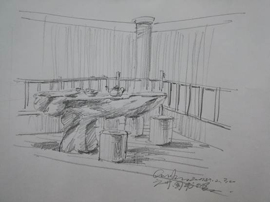 在跟着许老师小试牛刀之后,大家又选中阅读体验区的茶亭为临摹对象,准备趁热打铁,大展身手画出这个古色古香的阅读休憩空间。许老师先带领大家仔细观察了茶亭的结构和光线明暗分布,由于茶亭的结构稍复杂,许老师建议大家先画空间内部的主要物体——茶亭中间的树桩茶几,再画周边结构物体。这样既能突出绘画重点,又能避免物体大小被框架所限制,从而导致比例失调。在下笔一阵子后,不少读者都感到了难度和挑战,许老师见状,上前一一耐心指点。面对有些读者露出的怯意,许老师更是微笑着鼓励大家“画画是一件自我的事,不要太在意旁人的眼光和看法,重要的是自己画得开心,以自己的视角去勇敢创作,去发现美。”
