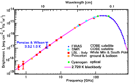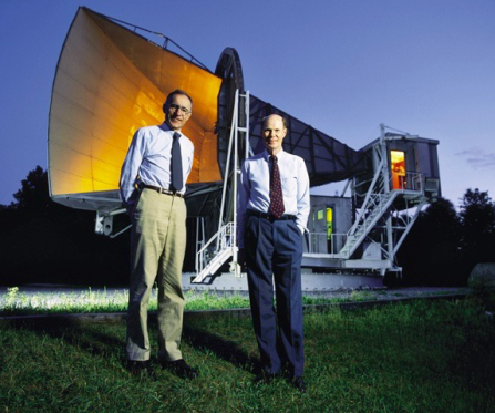 到了60年代,美国第一颗卫星上天以后很快发展了第一代通讯卫星,而提高通讯质量的重要一环就是将各种接收天线的噪声降到最低。贝尔实验室的无线电科学家Penzias和Wilson为此专门建造了一台喇叭口形的天线用卫星通讯的实验。他们最早注意到有些噪音虽然很小,但总是无法去除。这个噪声是在非常低的微波频段,这个频率对应的温度,用绝对温度来讲相当于-270度左右,也就是3度K,几乎达到绝对零度的温度。Penzias和Wilson对宇宙微波背景辐射的意外发现,使大爆炸宇宙学得到观测上的支持,成为现代宇宙学的基石。