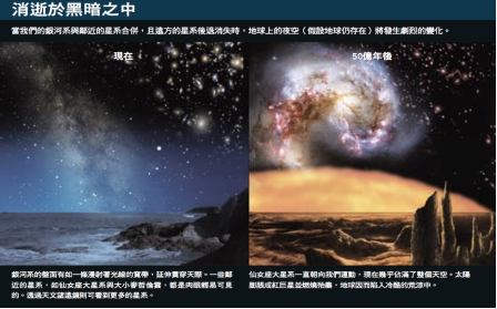 接下来出现的场景是,如果宇宙一直加速膨胀下去,遥远的星系在经过千百亿年的膨胀之后,我们今天所能看见的星系都会退行到我们的视界之外。那时,除银河系和仙女座星系并合产生的本星系外,整个遥远的天空将一片黑暗,整个宇宙的图景又将回到十九世纪赫歇尔的“宇宙岛”,我们重归孤独之中。