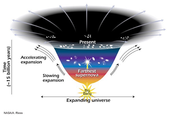 本世纪还有一个重要的发现:宇宙加速膨胀。用超新星宇宙学的方法,我们发现遥远超新星比我们原来想象的要暗,那就表明它处在更远的距离上,它意味着宇宙曾经跑得更快。天文学通过这种方式,最终证实宇宙实际上是在做加速膨胀。