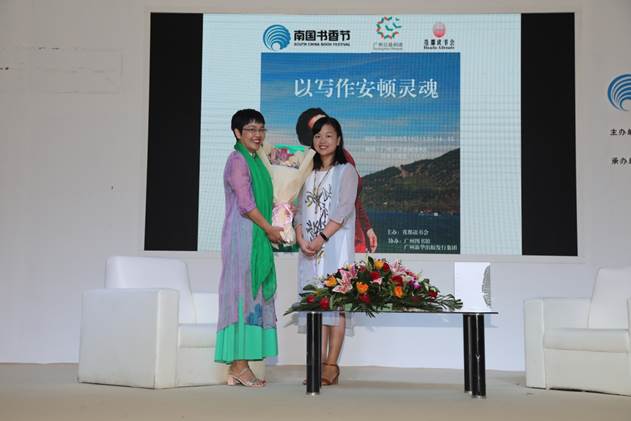 ▲花都读书会负责人郭利群(右)为陈小莉(左)献花
