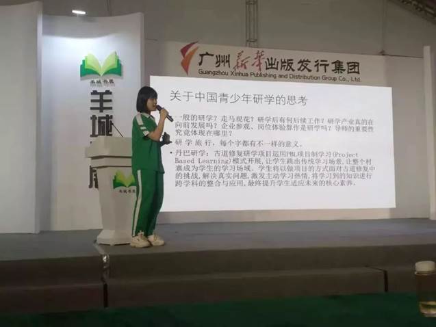 ▲8月16日上午,羊城书展馆文化活动区:由广州市越秀区博雅青少年发展中心承办的中学生甘孜藏区研学分享活动。广州市执信中学高二学生黄雨扬提出对青少年研学的思考。