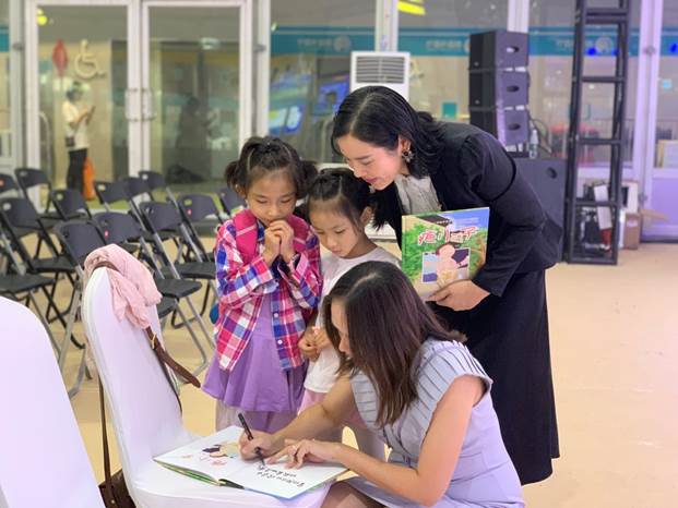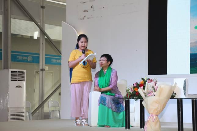 ▲8月19日下午,阅读推广沙龙区:由京京读书会承办的《疤小子》绘本分享暨签售会。绘本作者胡婷介绍了先天性心脏病孩子的情况,呼吁大家给孩子爱的教育。