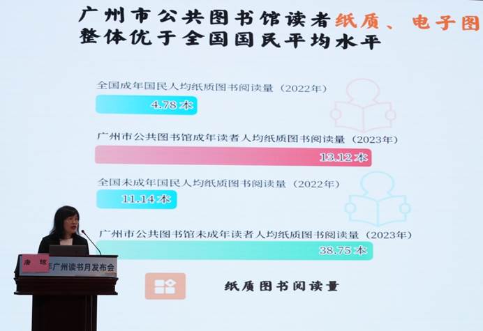 发布会上,中山大学信息管理学院副院长唐琼也发布了《2023年度广州市“图书馆之城”读者阅读报告暨公共图书馆全民阅读贡献力研究》,该研究发现,广州市成年读者和未成年读者的人均图书阅读量均为全国国民的2倍以上。广州的公共图书馆服务已形成覆盖城乡的全民阅读推广体系,实力“圈粉”读者:读者阅读的纸质图书,超七成数量来自公共图书馆;读者参加的阅读推广活动,超八成数量来自公共图书馆。此外,研究显示,读者在广州市公共图书馆获得良好阅读体验,总体满意度达86.74分。