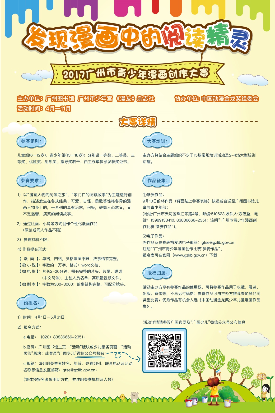 请于作品截稿日前将作品及参赛表格(附件1)发送电子邮箱:gtse@gzlib.org.cn;来稿请注明“‘广州市青少年漫画创作比赛’参赛作品”。