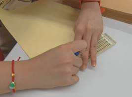 7月21日,这支特殊的小队准时到岗,孩子们分成两个小组,一组负责戳标签,一组负责校验,家长们则穿梭在书架间,负责图书的传递与归位,成为孩子们最坚实的后盾。从最初的手忙脚乱,到后来的井然有序,团队的默契在一次次协作中悄然生长。“这本书很薄,才 16 页呢,但书名的盲文点位可不少。”俊升一边摸着盲文书页,一边对照着模板认真戳点,语气里满是专注。校验组的同学则像“质检员”,仔细核对每一个细节:“这个声调点位错了,三点变成了两点”“这里漏了 2-2 的点位”“这本书是现行盲文”……他们用熟悉的盲文规则为馆藏资源做了一次深度“体检”。那些被忽略的模糊点位、新旧盲文体系的差异、易混淆的声调符号,217本盲文图书在他们敏锐的触觉与严谨的校验中无所遁形。