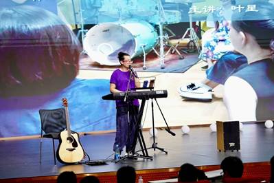 在一阵爽朗的钢琴声中,本次活动的主讲嘉宾叶星开始了自我介绍,大家开始了解他从事音乐教育以来的职业生涯:叶星,原名叶鸿伟,毕业于星海音乐学院音乐教育系,2012年在少年宫从事音乐教学时首次接触视障群体并与之结缘,这一开始就坚持了十一年,为了方便视障学生学习音乐,他于2018年10月8日在广州市启明学校附近创办了鸿声音乐工作室,并于2022年10月与两位优秀的视障音乐老师合伙运营,致力于搭建人人可享的音乐平台。如今他培养的一批又一批启明学子不仅在各种比赛中荣获佳绩,还通过音乐找到了对生命的热爱。“在我的心目中教书育人不仅传道授业,还要像星辰一样为学生照耀夜空指引方向,所以在前几年的时候我改名为叶星。”说到这里,叶星给大家带来了自己自弹自唱的原创歌曲《星的连接》,温暖的旋律和细腻的嗓音,不仅让大家感受到了音乐的魅力,还让现场的读者一下子沉浸到了歌唱世界中。