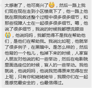 本次活动顺利的开展还离不开安全伴读志愿者的保驾护航。他们身着红色马甲,前往相应的地铁站与公交车站接应报名的视障人士,带领他们来到影院,尽管他们之中有的是刚刚接受培训的新手,尽管他们之中有的是第一次搀扶,但是每个人都是神情严肃认真,步伐放缓,还轻声讲解实地路况,他们在这炎炎夏日中形成了一道充满爱的防护线。