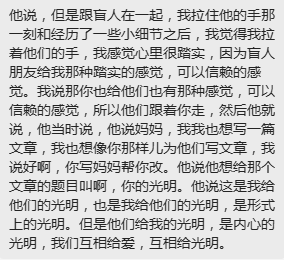 一位视障人士的陪同人与工作人员袒露心声,她讲述到家中出现一个视障人士生活是很艰苦的,但这些公益活动让她感到了无比温暖,她感谢那些为这类特殊人员提供帮助的工作人员与社会团体。是的,让视障人士及一些特殊人群共享社会文化成果,让他们融入信息时代,融入现代社会生活,这是一项光荣而有责任感与使命感的工作。广州图书馆“最美慈善空间”的桥梁作用发挥的十分到位,联合了多方力量举办这次特别活动。