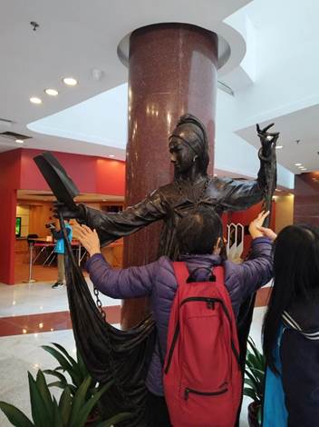 到达之后,红线女艺术中心讲解员对其建筑风格、场地布局、资源建设、收藏布置以及具有纪念意义的题词、雕塑等进行了导览。走进大堂、迎面镌刻着一代伟人毛泽东雄浑苍劲的手迹:“活着、活着、更活着,变成了劳动人民的红线女……”跟着讲解员的脚步,志愿者的陪伴,读者走读参观了整个建筑。其中6座不同装扮的红线女雕塑引起了视障人士极大的兴趣,分别是:《搜书院》的“翠莲”、《昭君出塞》的“王昭君”、《关汉卿》的“朱帘秀”、《山乡风云》的“刘琴”、《李香君》的“李香君”、《白燕迎春》的“沈洁”,讲解员和口述员以及伴读志愿者引导他们对其进行了触读,感受了其艺术之美。在二楼展厅讲解员带领大家参观了“我的生命属于艺术,我的艺术属于人民”主题展览,以围绕红线女的艺术人生为主,按照时间顺序介绍和讲述她的一生。