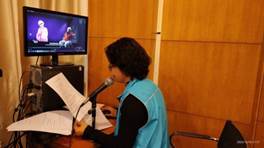 在走读结束之后,志愿者带领视障读者落座多功能厅,欣赏口述纪录片《一代天娇——红线女》。该纪录片由中共广州市委宣传部指导,广州市文化广电旅游局监制,红线女艺术中心出品。据悉,这是世界首部横跨亚、欧、美三大洲的粤剧人文纪录片,也是最全面展现粤剧人物的纪录片。片中展现了许多从未公开的照片、影像资料,再现红线女一生中的重要节点和人生亮点。另外邀请了众多具有代表性的粤剧艺术家参与表演,增强了纪录片的戏曲感和观赏性。在舞台上她塑造了众多深刻动人的艺术形象,无数经典作品深入人心。通过星辰社口述员黄丽玫、李洁莹、劳炎和、曾海燕的讲解与分享,让视障读者也切实感受到红线女的一生都在与粤剧打交道。她创造了享誉海内外的“红派”艺术,塑造的一个个光彩夺目的舞台形象,在粤剧史上留下绚丽篇章。同时体现了对粤剧艺术的执着追求、精益求精的精神,以及为了粤剧事业的发扬与传承呕心沥血,致力于培养粤剧接班人,赢得了广大观众、广大艺术同行的尊重和敬佩。