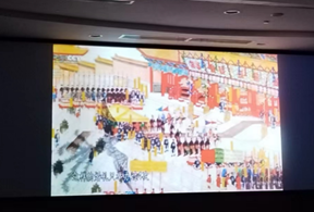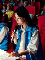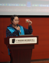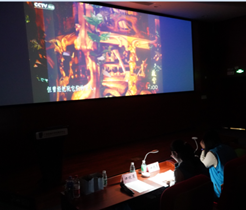 灯光逐渐暗下来,“本集进入片头,随着镜头拉远,太和殿、文渊阁、乾清宫等宫殿名称,纷纷嵌入长方形故宫模型当中……”口述员详述着影片中的场景,按照乾清宫、交泰殿、坤宁宫、奉先殿、箭亭、文华殿……顺序依次呈现了建筑的特色、功能,观众聚精会神聆听画面的转换。口述员蔡健欣、林梦诗、张慧敏虽然是在校大学生,但是在曾海燕老师的细心指导下,加上有了前两期几位口述员的成功经验以及自身勤奋努力,凭借流利的讲解和专业的解说技巧,折服了现场观众。为了更好呈现活动效果,曾老师带领口述员利用休息时间多次在广州图书馆进行口述练习。整场活动口述非常清晰流利,对片中的场景解说非常到位,现场观众发出热烈掌声,现场口述效果显著。