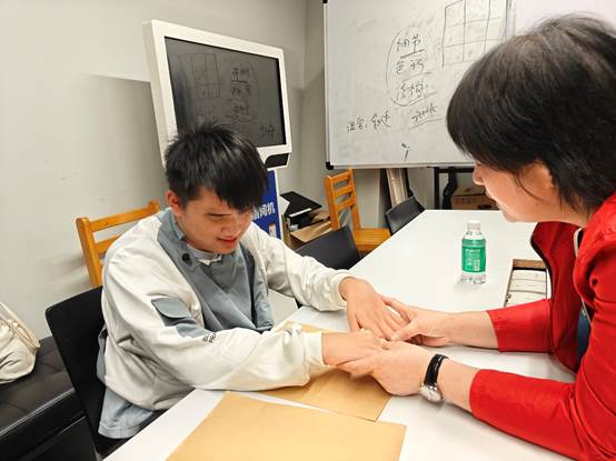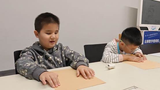 为帮助孩子们更直观地理解剧情、感知角色,活动特别为每位参与儿童配备了《咕咚来了》国家通用盲文辅助读本和“兔子”“狐狸”“大象”等故事核心角色的立体动物模型。孩子们一边聆听故事,一边用小手触摸盲文、摩挲模型的立体肌理,在触觉与听觉的双重联动中,清晰构建起故事场景与动物形象,有效巩固了盲文基础,也加深了对故事寓意的理解。