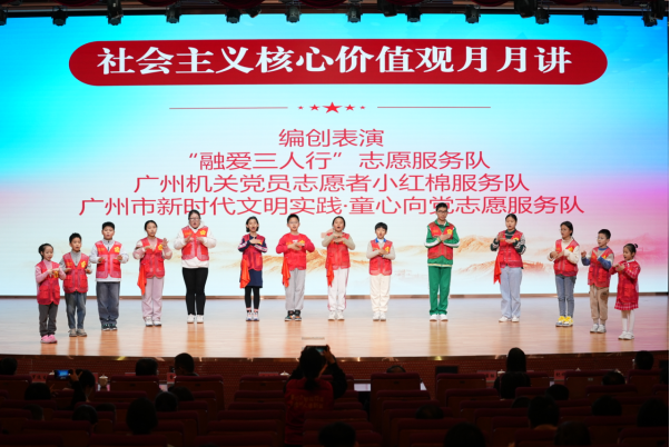 此外,广州机关党员志愿者小红棉服务队等队伍带来了《社会主义核心价值观月月讲》主题演出,汪翊律师分享了其在广图十几年如一日的“六边形战士”多领域服务感悟。最后,广州市青年文化宫管弦乐团小号首席王者的激昂演奏,为活动画上圆满句号。