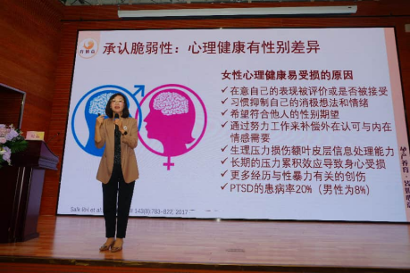 “勇敢说‘不’,并不会摧毁我们的生活,反而会让我们更接近真实的自己。”谢菲老师的话语,给在场每一位女性注入了勇气。她结合性别差异研究指出,女性更易承认自身的脆弱性,数据显示PTSD(创伤后应激障碍)的女性患病率高达20%,而男性仅为8%,这也意味着女性需要更多的心理关注与自我关怀。