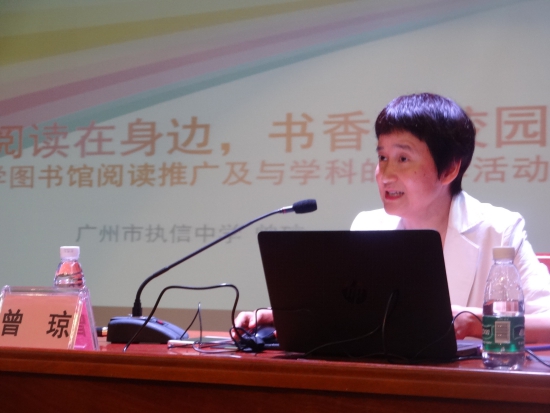 图3.执信中学曾琼老师作《书香校园中学校图书馆与学科合作的探讨》讲座