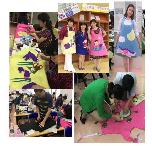 开课后,方老师先用上午的时间带领学员深入细致地赏析绘本故事,并为大家传授说故事的“十八般武艺”;下午,方老师手把手地教学员进制作故事衣,少儿图书馆提供精选的推荐绘本,大家各自选好素材图书,热火朝天地操练起来。经过一番裁剪绘粘,随着一件件围裙式“故事衣”的诞生,绘本图书中的角色形象纷纷“跃然衣上”,穿着这样一件醒目的“故事衣”在讲故事,将更能吸引孩子们的眼球。方老师还教大家进行创新,配套制作相关的小手偶,学员们迅速掌握新技能,新鲜出炉的作品穿上身,齐齐来个大合影,成就感满满哒----第一天课程结束,成效显著。