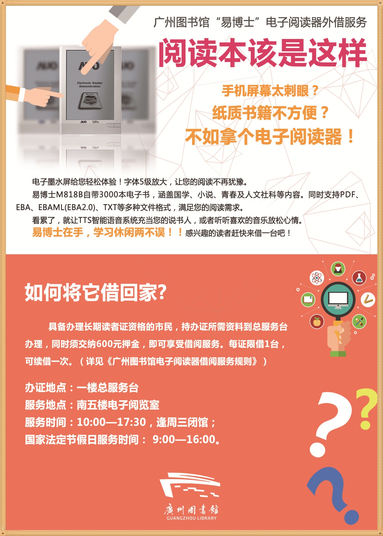 随着数字资源的迅速发展,如今移动阅读已成了一种生活习惯。由于电子墨水屏的电子阅读器不刺眼、又轻便,所以深受移动阅读者的喜爱。广州图书馆馆提供的电子阅读器外借服务一直深受广大读者的欢迎。电子阅览室每年针对电子阅读器开展应用培训学习班.