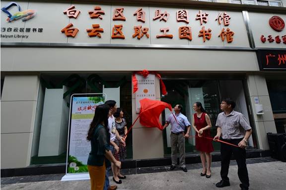 2017年8月11日上午10时,白云区自助图书馆正式对外开放,并举行了简单而隆重的揭牌仪式。出席仪式的领导嘉宾有广州图书馆副馆长李慧敏、区文广新局局长刘明学、区总工会常务副主席舒良保、团区委书记靳笛、区总工会副主席沈灼升、区文广新局副局长徐翠娟、区文广新局社文科科长徐筠、区体彩中心主任李媚及各镇街文化站负责人。李慧敏、刘明学、舒良保、靳笛、徐翠娟、沈灼升等领导共同为自助图书馆揭牌。刘明学在揭牌仪式上致辞,指出自助图书馆建成开放是区图书馆实施智能化计划、树立文化品牌的重要一步,对进一步完善白云区公共文化服务体系有重要意义,也对各单位在自助图书馆建设过程中的支持与帮助表示感谢。揭牌仪式后,嘉宾参观了自助图书馆,并体验了馆内各项服务设施。